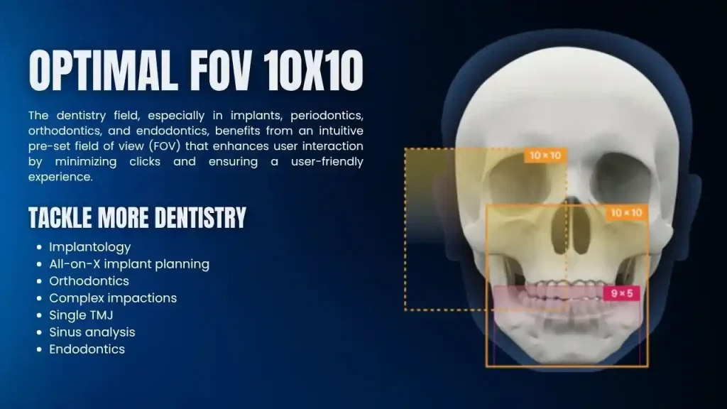 - 10×10 FOV covers full dentition, single TMJ, sinus, and 3rd molars.